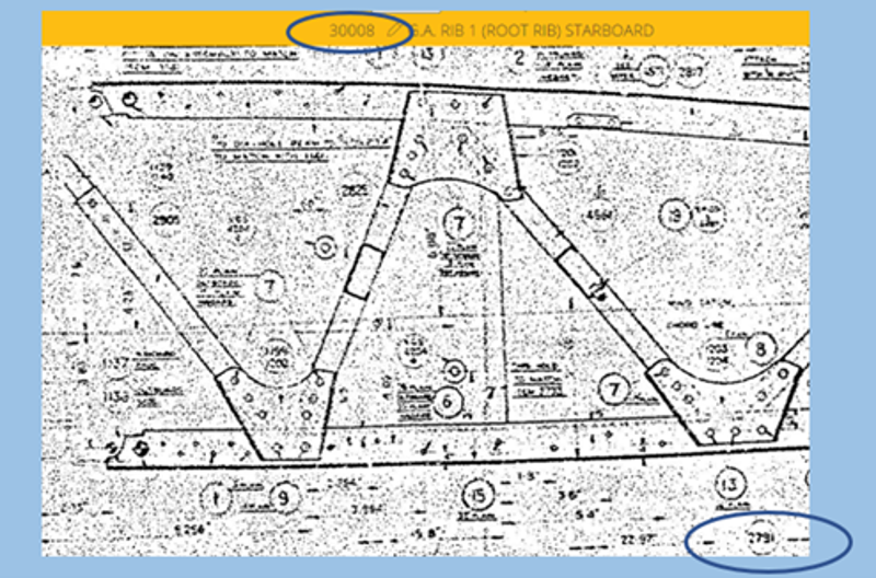 Wrakrest met codering 3008 2791wat refereert aan een Root Rib aan Starboard kant van Spitfire, zie technische tekening hieronder